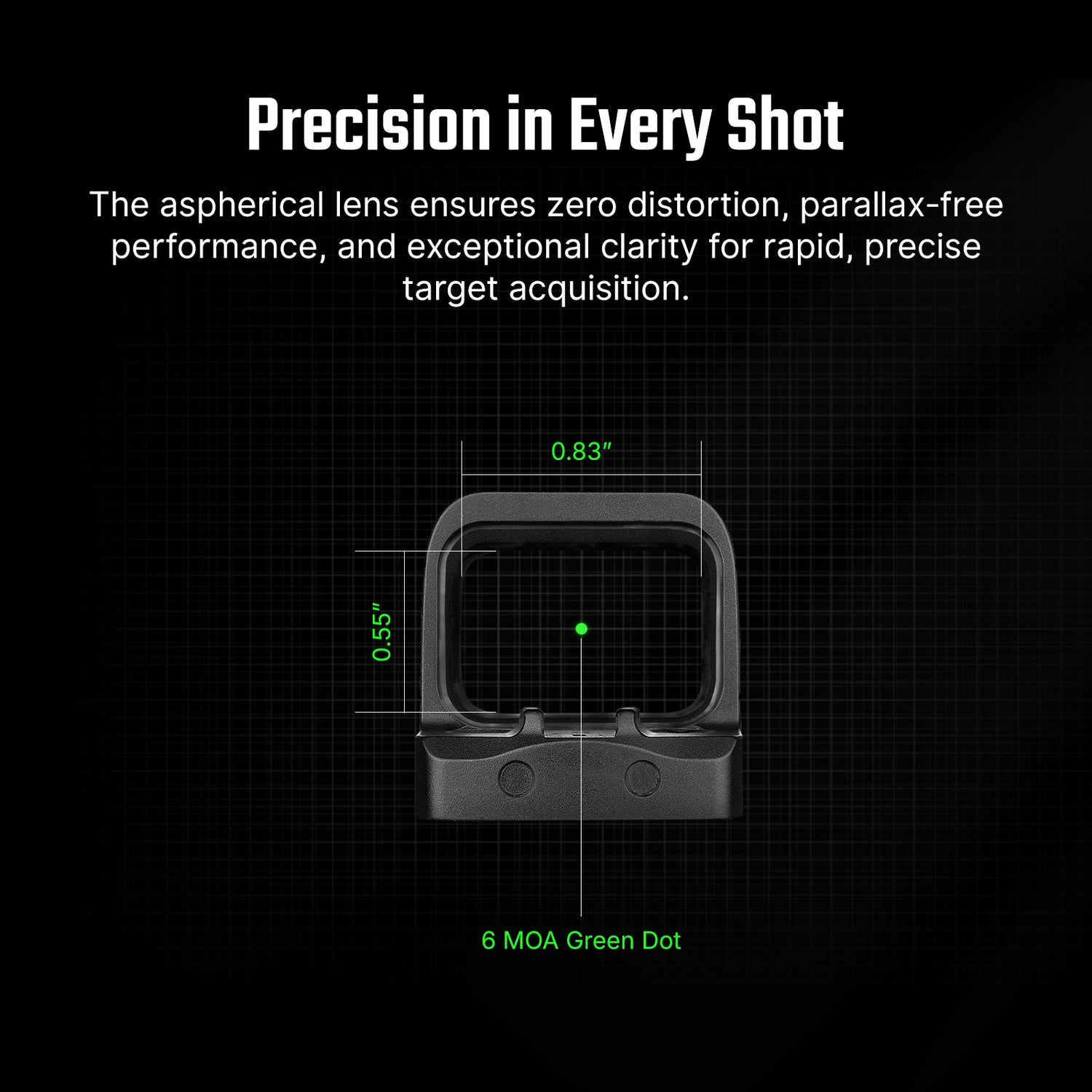 • Asfærisk Linse: Den asfæriske linsen sikrer null forvrengning, parallaksefri ytelse og eksepsjonell klarhet for rask, presis målanskaffelse.