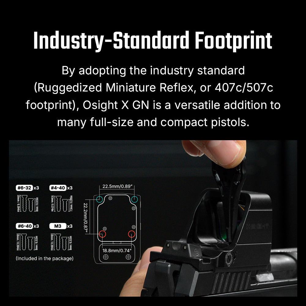 • Mest Vanlige Fotavtrykk: Ved å bruke de facto industristandard (Ruggedized Miniature Reflex, eller 407c/507c fotavtrykk), passer Osight X GN mange fullstørrelse og kompakte pistoler. Osight Picatinny montasjer gir enda mer allsidighet med både høye og lave alternativer for de fleste riflesystemer.