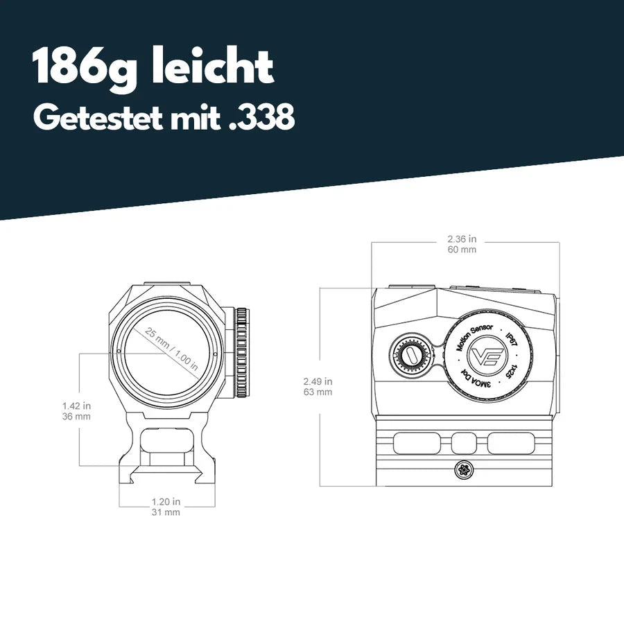 • Montering: 21 mm Weaver & Picatinny-skinne